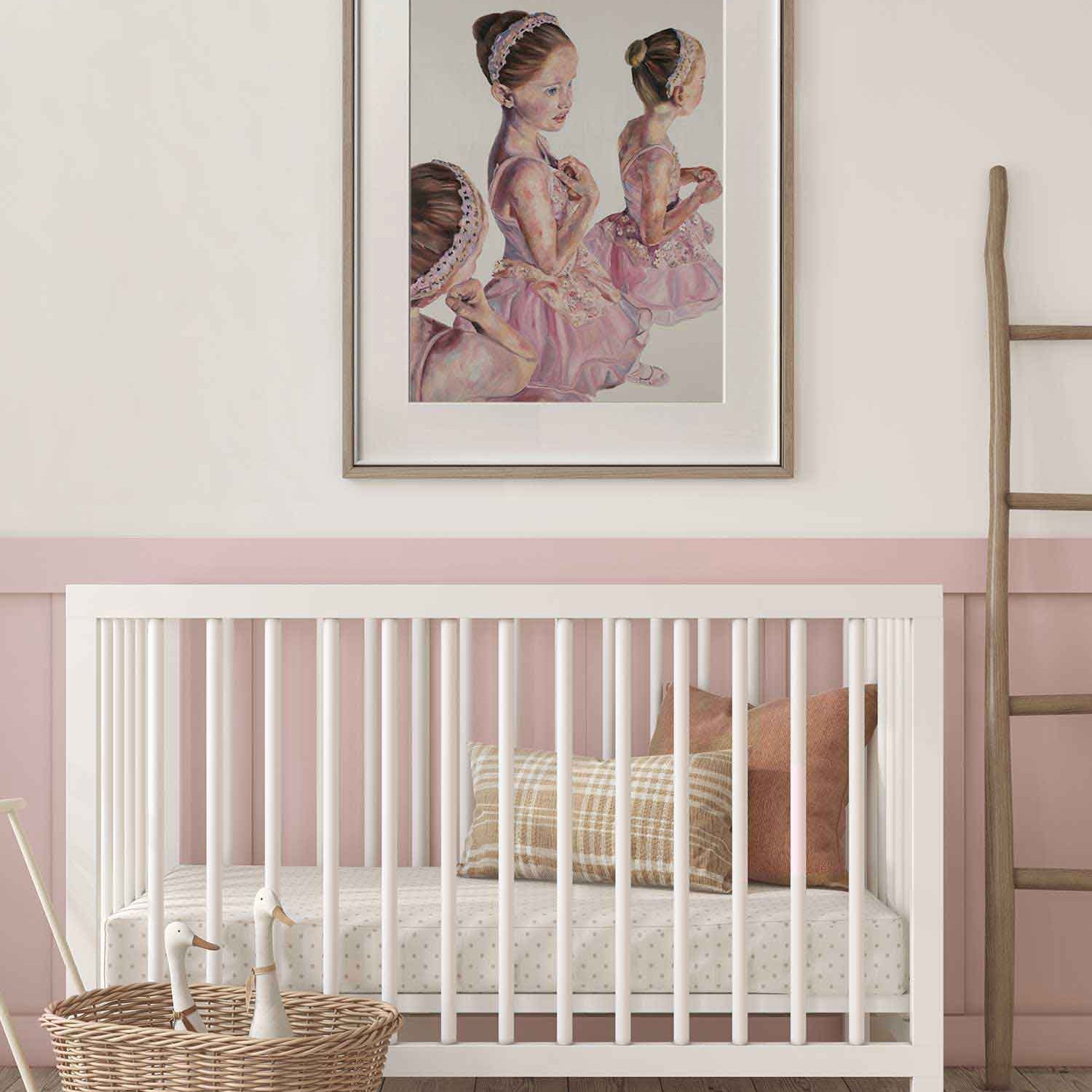 The warm glow of the stage lights embraces her in a moment of reflection and aspiration, making this piece a perfect addition to a child’s bedroom or a thoughtful gift for anyone who cherishes ballet and the elegance of dance.