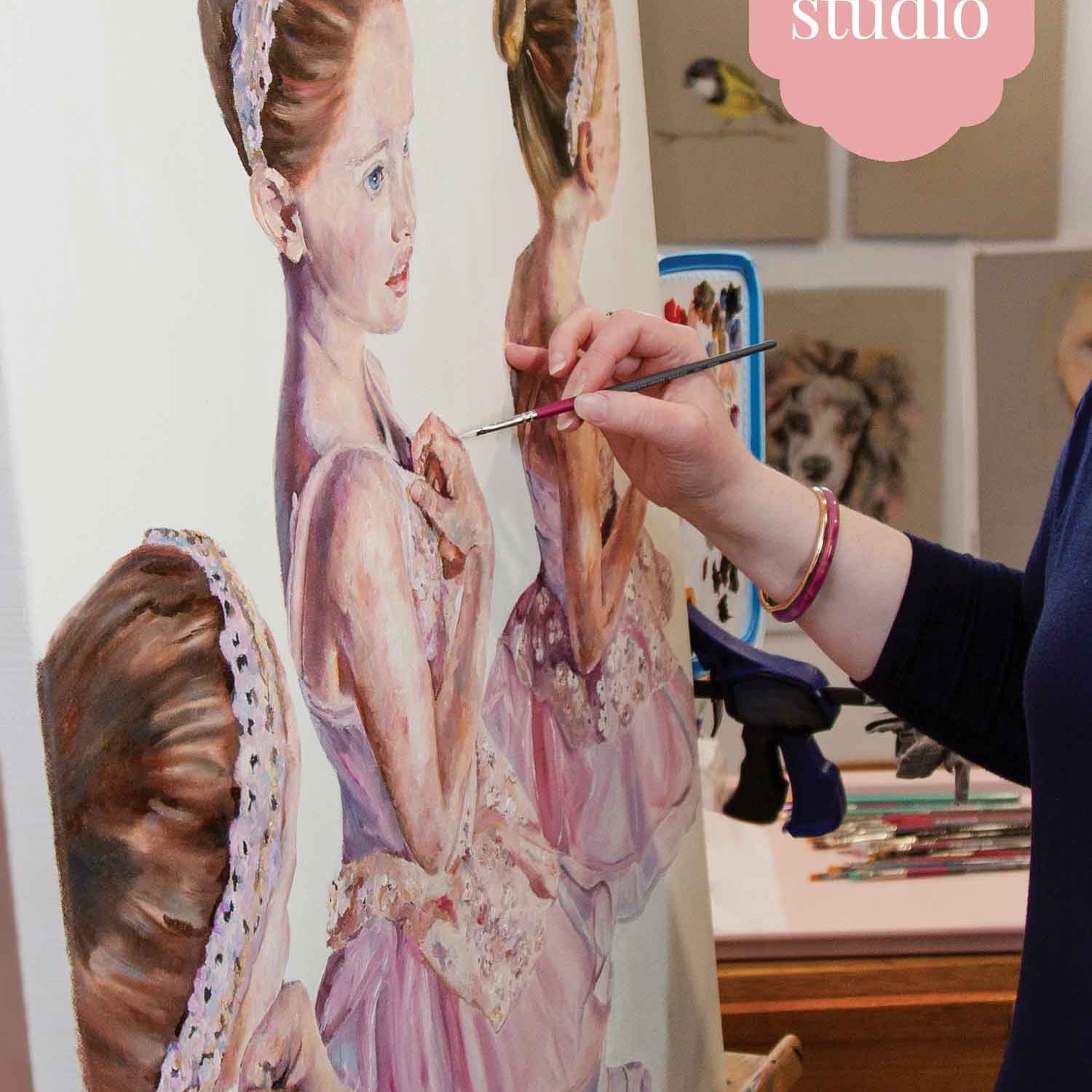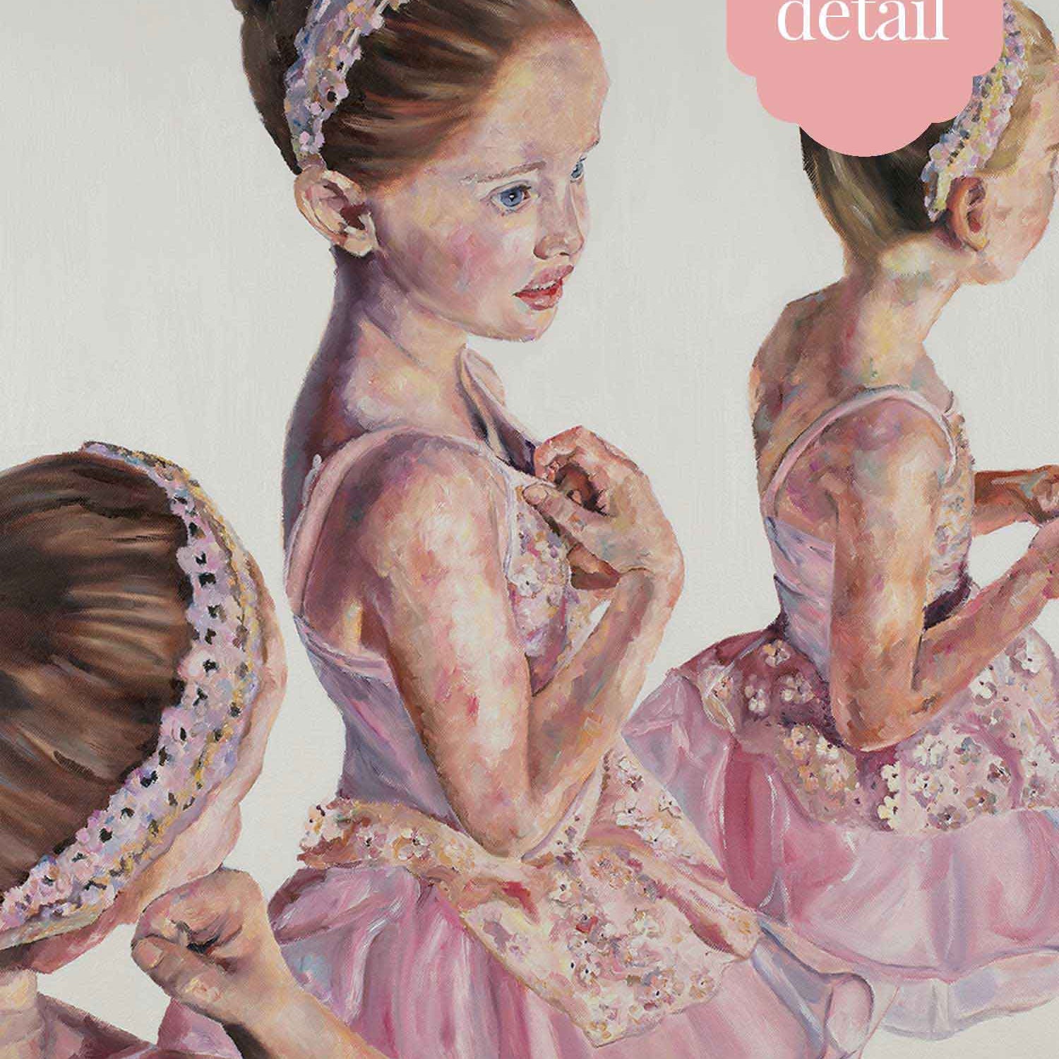 This exquisite oil painting captures a young ballerina, Alice, standing side stage, her gaze filled with admiration and quiet determination as she watches the seasoned dancers before her.